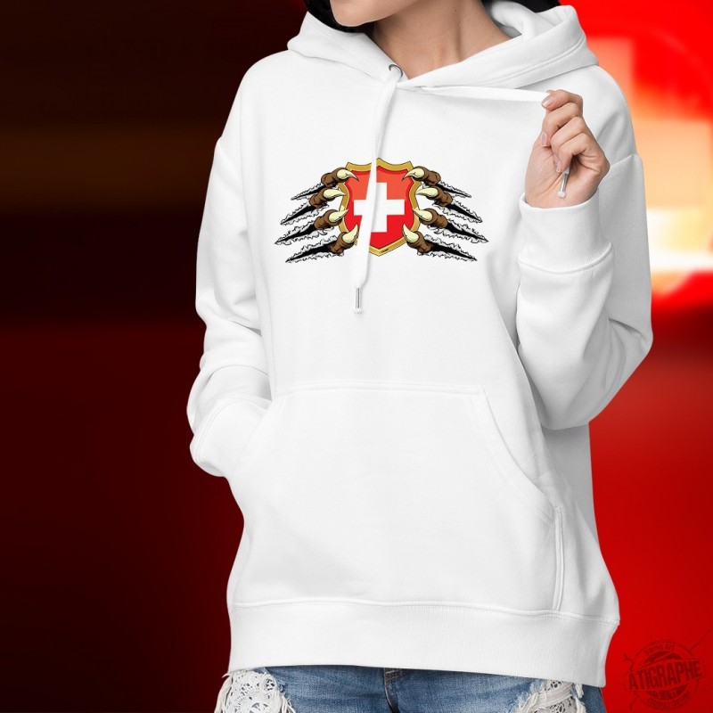 Pull-over humoristique blanc à capuche dame avec l'écusson de la Suisse, une croix blanche sous fond rouge, tenu par des griffes déchirant le pull