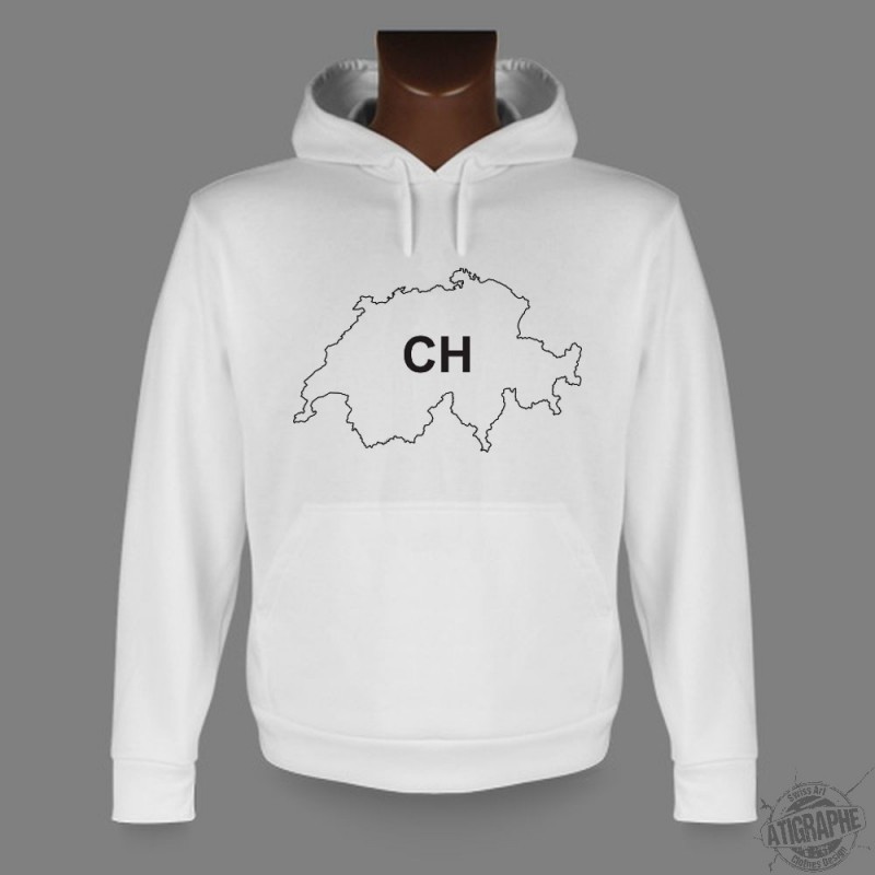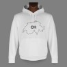 Sweatshirt blanc à capuche, pour femme ou homme, illustré des frontières de la Suisse entourant le sigle "CH"