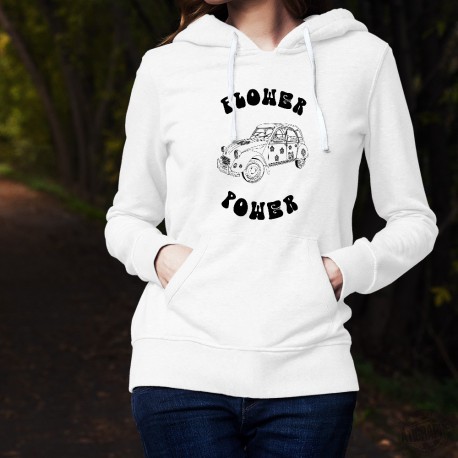 Sweatshirt humoristique à capuche mode dame illustré d'une Citroën Deux Chevaux hippie et de la citation "Flower Power"