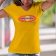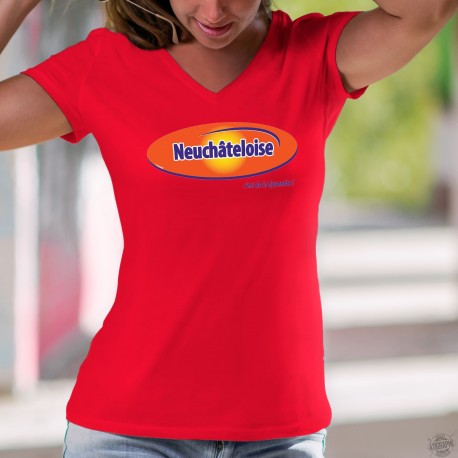 T-shirt dame illustré de la citation ★ Neuchâteloise, c'est de la dynamite ! ★, le slogan de la célèbre marque de pâtes à tartiner, de barres et de boissons à base d'oeuf, de malt et de chocolat