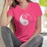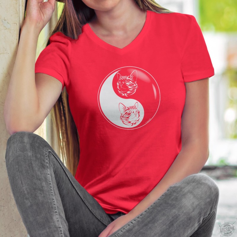 T-shirt en coton mode dame illustré de la tête d'un chat blanc et et d'un chat noir, dessiné à la façon d'un tatouage tribal, à l'intérieur du Yin et du Yang de la philosophie chinoise