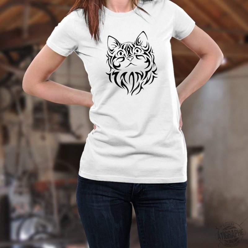 T-shirt à la coupe très féminine illustré du portrait d'un chat dessiné dans le style d'un tatouage tribal