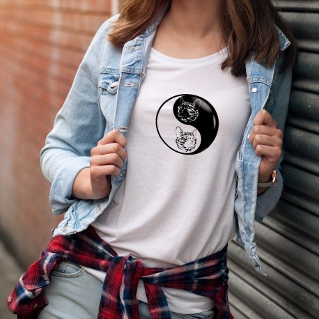 T-shirt à la coupe très féminine illustré de la tête d'un chat au design tribal (tatouage) à l'intérieur du Yin et du Yang.