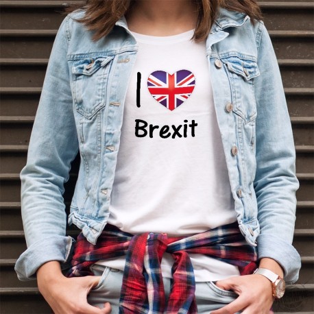 T-shirt à la coupe très féminine, illustré d'un coeur aux couleurs du Royaume-Uni (Union Jack) et de la citation "I Love Brexit" (J'aime le Brexit)