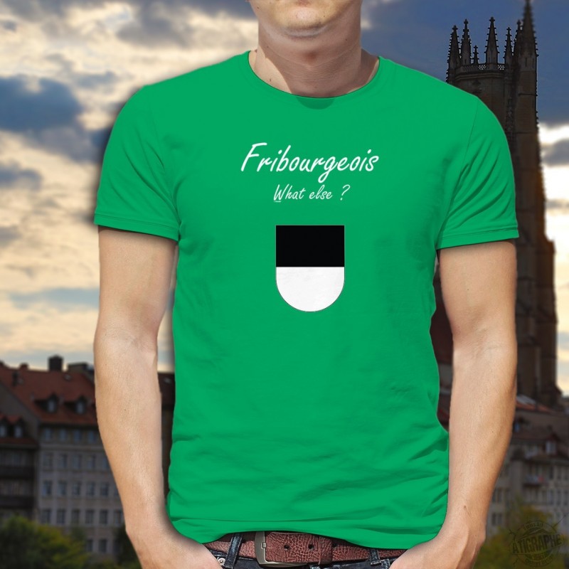 T-shirt coton illustré du célèbre texte ★ Fribourgeois, What else ? ★ tiré d'une marque de café espresso bien connue et de l'écusson du canton de Fribourg