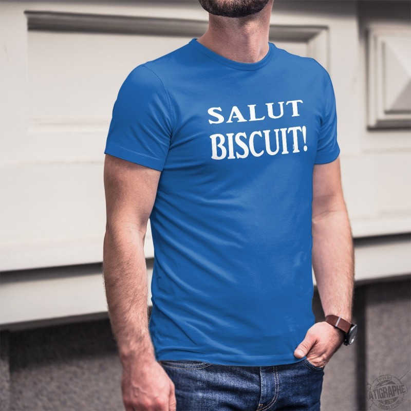 T-shirt coton illustré de l'expression fribourgeoise ★ Salut biscuit ! ★ que l'on peut traduire part "eh ben dis donc !" Salut biscuit! c'te Bénichon c'était pas de la gnognotte