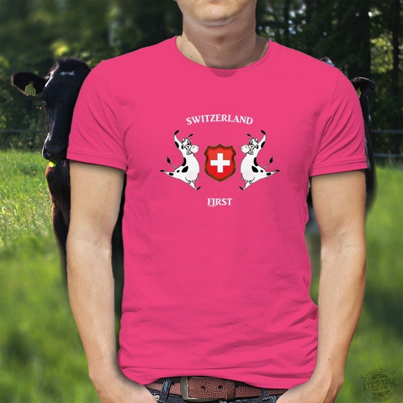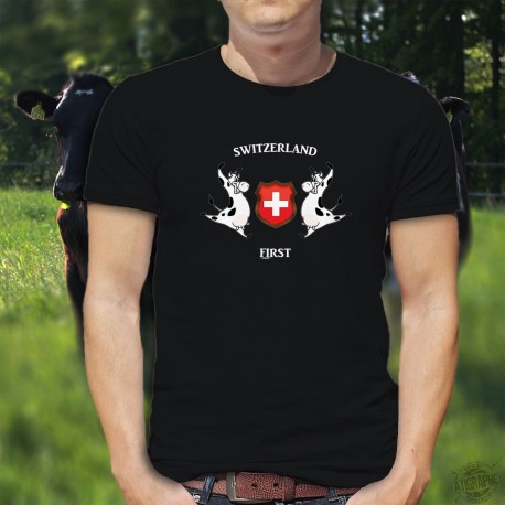 T-shirt 100% coton illustré de la citation "Switzerland First" et de deux vaches Holstein entourant le blason de la Suisse