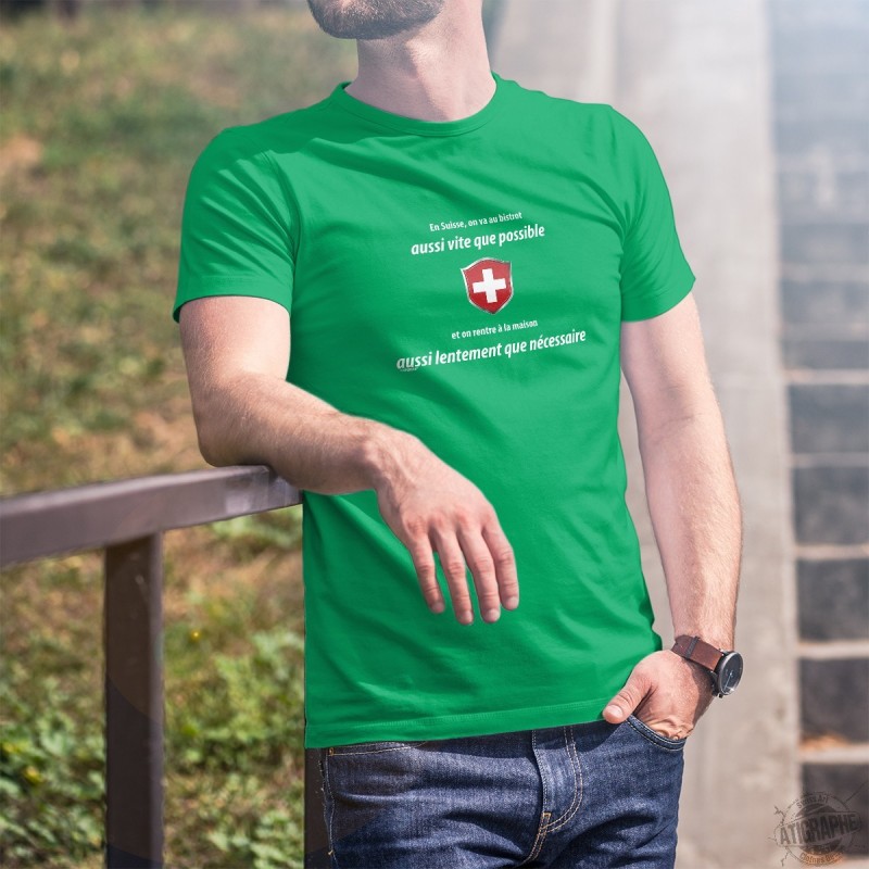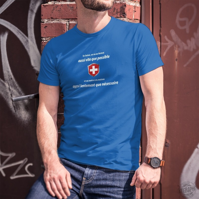 T-shirt coton inspiré de la phrase culte de notre ministre de la santé, fribourgeois d'origine, Alain Berset ✚ En Suisse on va au bistrot aussi vite que possible et on rentre à la maison aussi lentement que nécessaire ✚