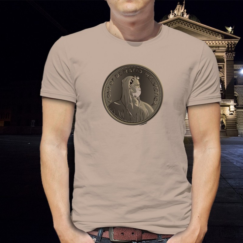 T-shirt homme illustré de l'effigie d'un Berger (souvent confondu avec Guillaume Tell) provenant de la pièce d'une Thune (pièce de 5CHF) et portant un masque chirurgical pour se protéger du Coronavirus.