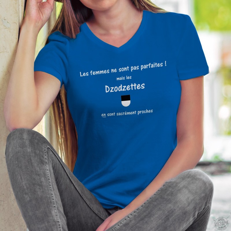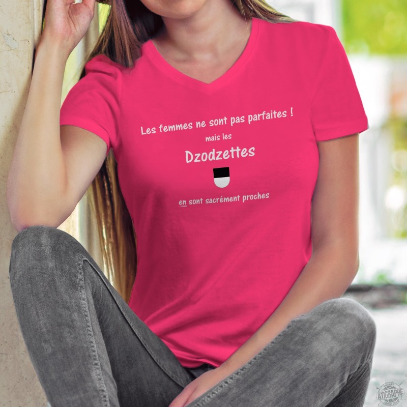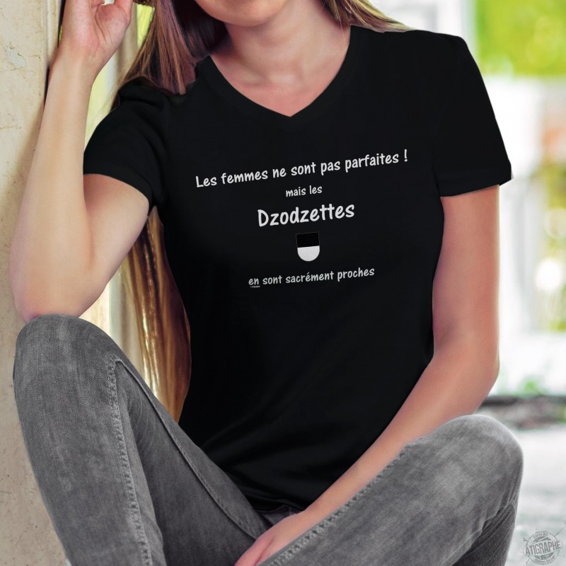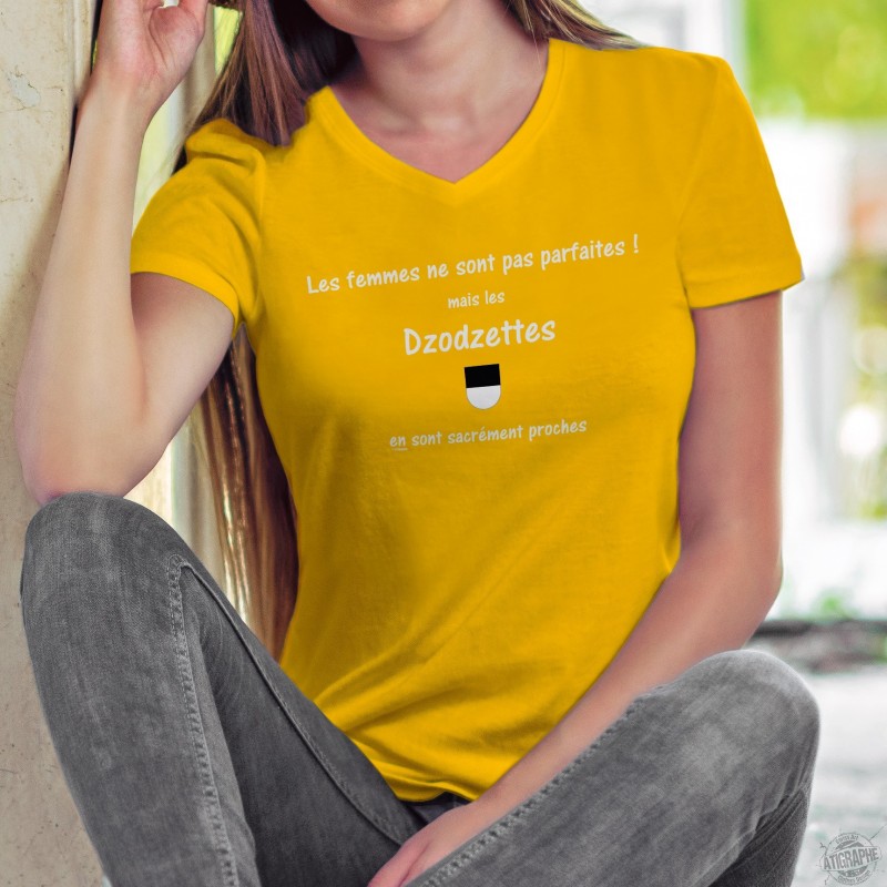 T-shirt à la coupe très féminine illustré du drapeau fribourgeois et de ✿ Les femmes ne sont pas parfaites ! mais les Dzodzettes en sont sacrément proches ✿