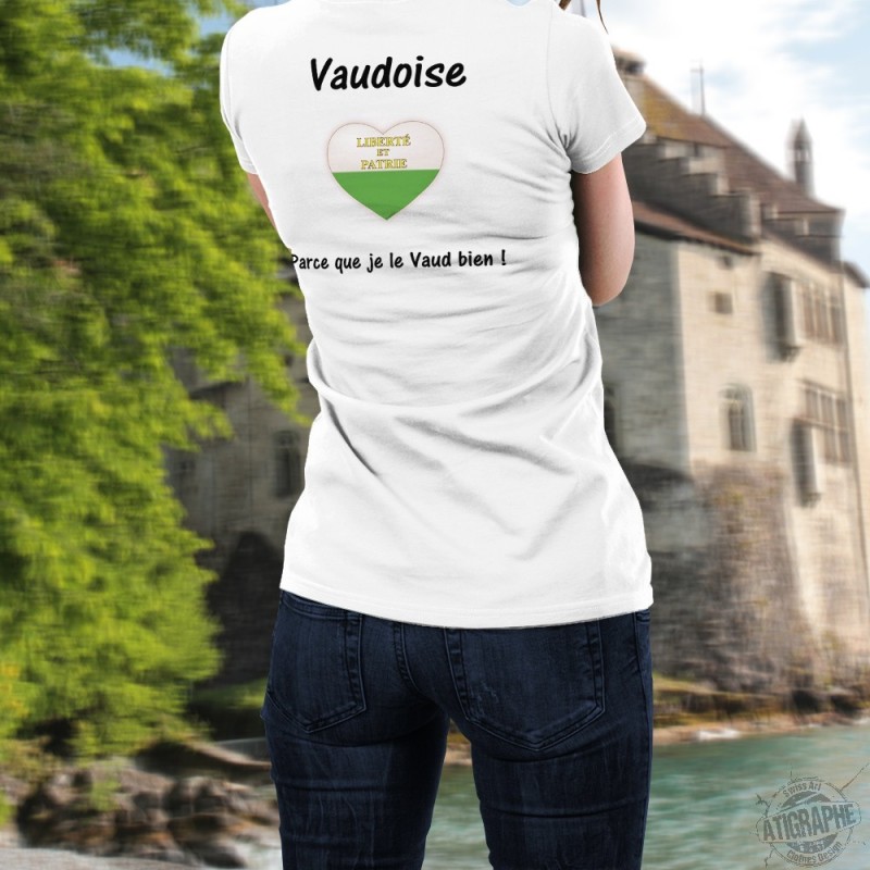 T-shirt à la coupe très féminine illustré d'un coeur vaudois et du célèbre slogan d'une marque de coloration des cheveux "Vaudoise, parce que je le Vaud bien !"