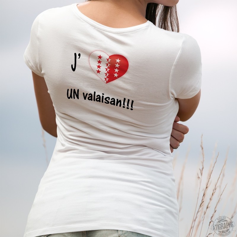 T-shirt à la coupe très féminine, illustré du drapeau valaisan en forme de coeur et de la citation "J'aime UN valaisan"