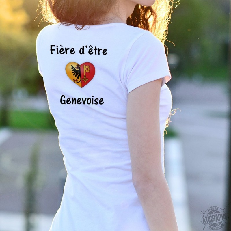 T-shirt à la coupe très féminine, illustré d'un coeur au couleurs de Genève et du slogan "Fière d'être Genevoise"