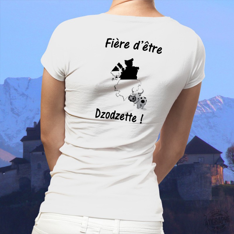 T-shirt à la coupe très féminine, illustré des frontières au couleurs du canton de Fribourg d'une vachette et du slogan ❤ Fière d'être Dzodzette ! ❤