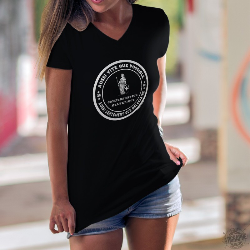 T-shirt 100% en coton pour dame illustré d'un emblème contenant l'effigie de "Dame Helvetia" et la nouvelle devise de la Suisse selon notre ministre de la santé Alain Berset ✚ Aussi vite que possible ✚ Aussi lentement que nécessaire ✚