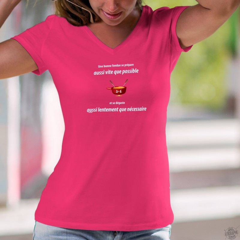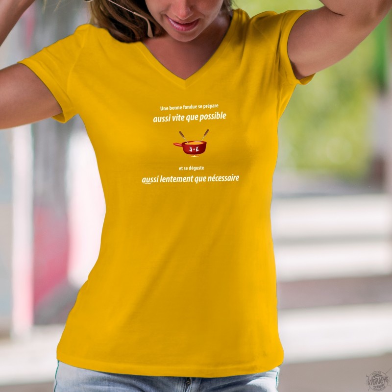 T-shirt coton dame avec un caquelon à fondue et une adaptation de la phrase culte d'Alain Berset ✚ Une fondue se prépare aussi vite que possible et se déguste aussi lentement que nécessaire ✚