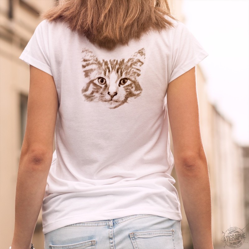 T-shirt à la coupe très féminine, illustré du portrait d'un chat Norvégien au crayon