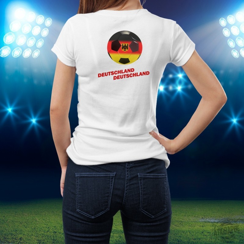 T-shirt pour dame illustré du drapeau allemand sous fond de balon rond, et du slogan "Deutschland Deutschland"