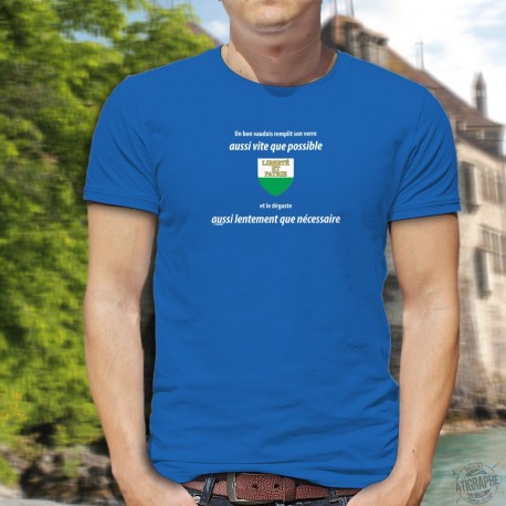T-shirt coton inspiré de la phrase culte de notre ministre de la santé, Alain Berset ✚ Un bon vaudois remplit son verre aussi vite que possible et le déguste aussi lentement que nécessaire ✚ Phrase très populaire en Vaudoisie
