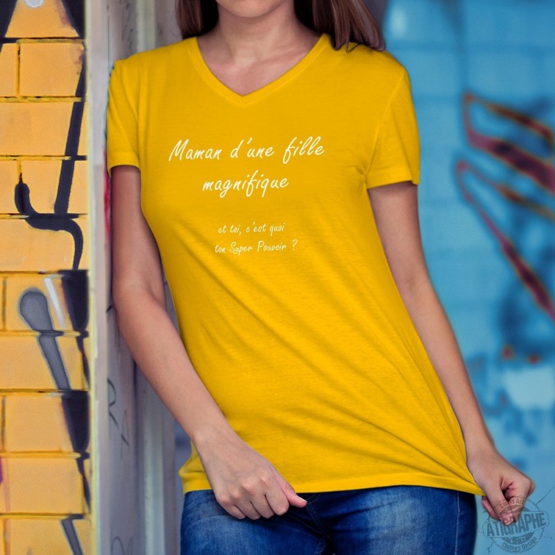 T-shirt dame illustré de la citation "Maman d'une fille magnifique... et toi, c'est quoi ton Super Pouvoir ?", pour toutes les mamans d'une ou plusieurs filles.