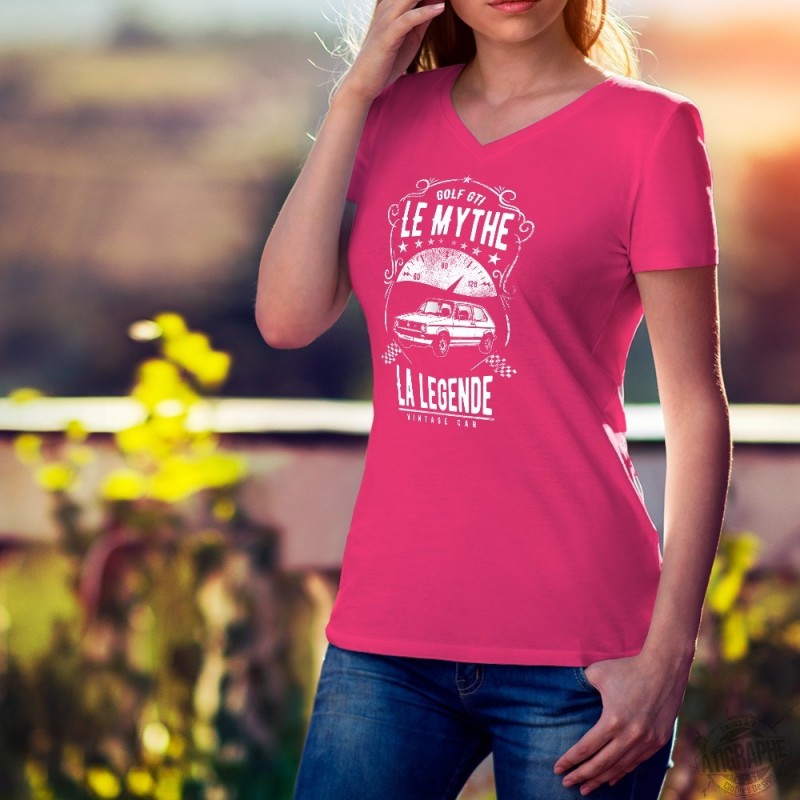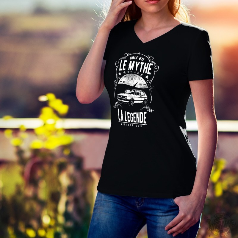 T-shirt dame illustré de la citation "Golf GTI, le Mythe, la Légende" et de la célèbre VW Golf GTI qui a été présenté en première au salon de Francfort en 1975