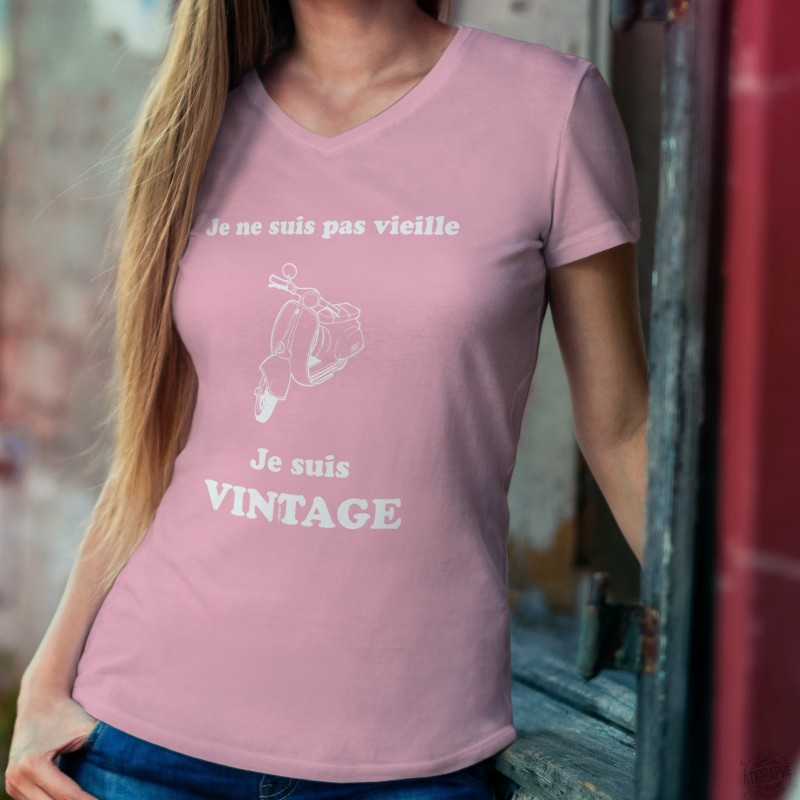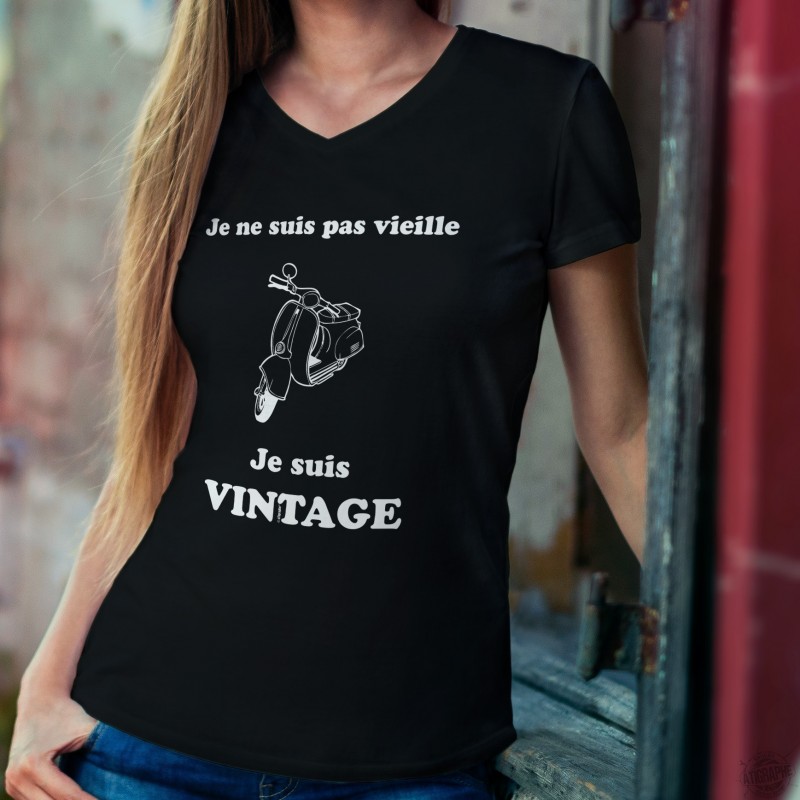 T-shirt dame en coton illustré de la célèbre Vespa (scooter italien de légende) et de la citation humoristique "Je ne suis pas vieille, je suis Vintage"
