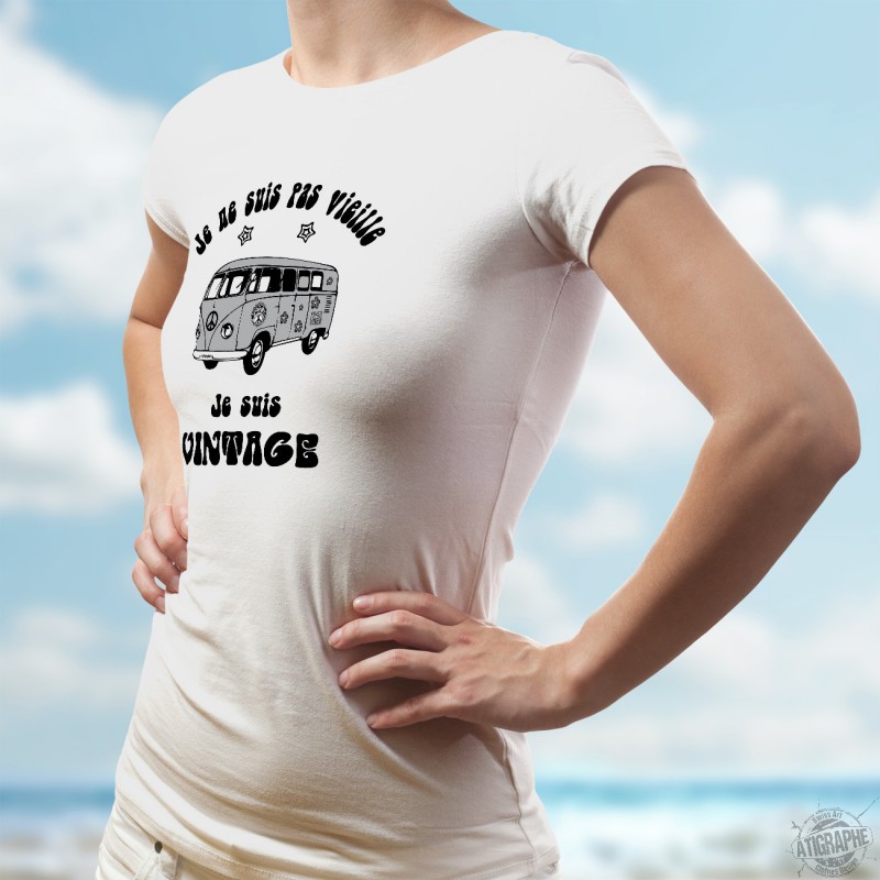Un T-shirt dame pour revivre vos années hippies illustré d'un bus VW Combi (Camper) et de la citation humoristique ✿ Je ne suis pas vieille, je suis Vintage ✿