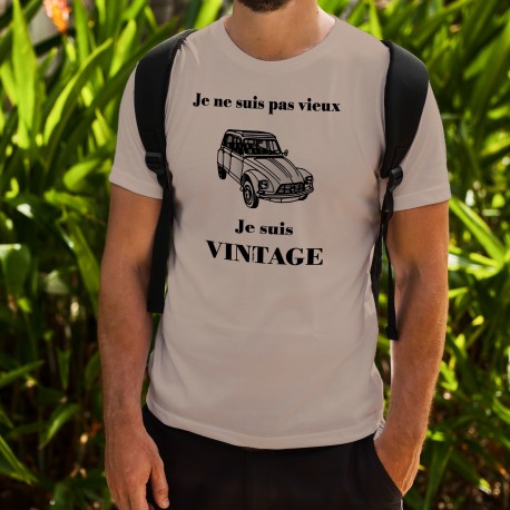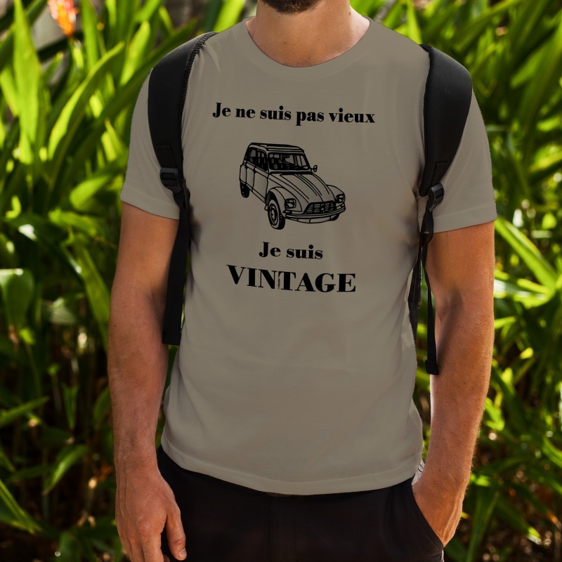 Tee-shirt illustré de la célèbre Dyane et de la citation humoristique "Je ne suis pas vieux, je suis vintage"