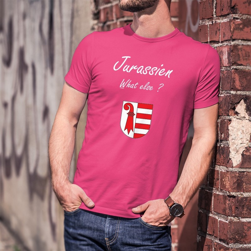 T-shirt coton illustré du célèbre texte ★ Jurassien, What else ? ★ tiré d'une marque de café espresso bien connue et de l'écusson du canton du Jura