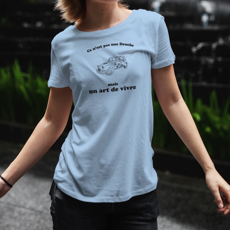 T-shirt dame coupe standard illustré de la célèbre 2 Chevaux (2CV), de fleurs hippies et de la citation "Ce n'est pas une Deuche mais un art de vivre"