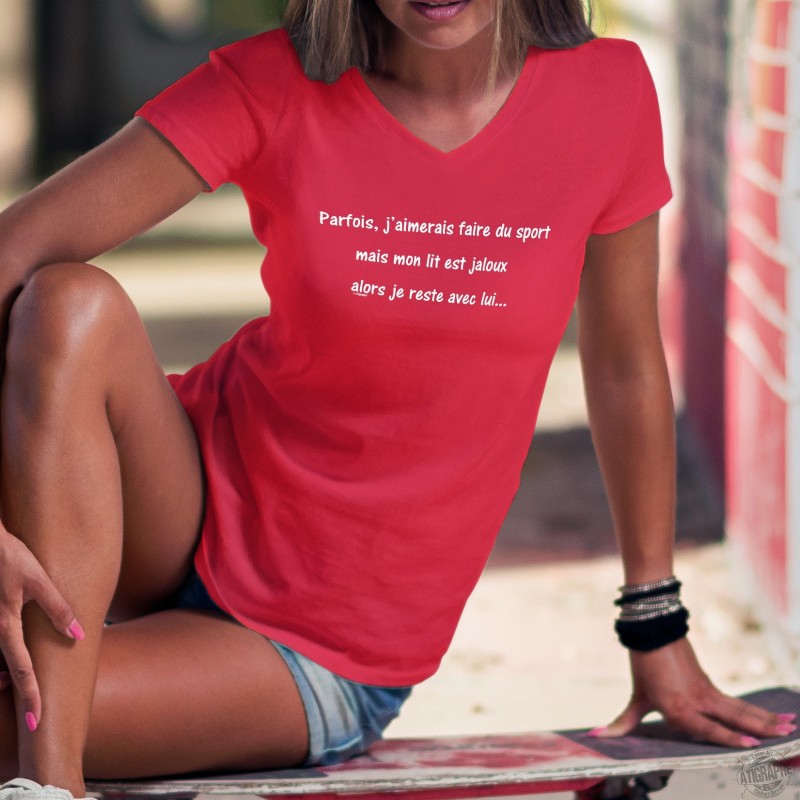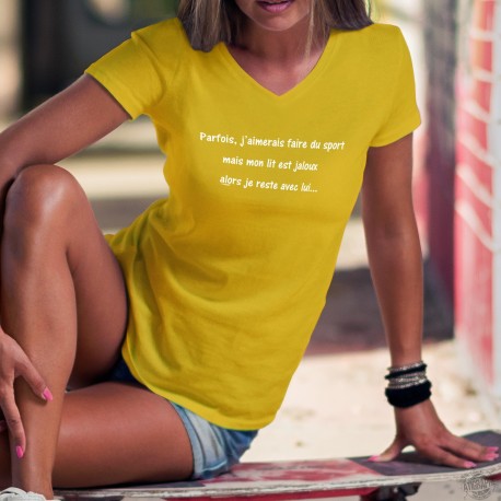 T-shirt coton dame avec la citation ★ Parfois, j'aimerais faire du sport mais mon lit est jaloux, alors je reste avec lui ★