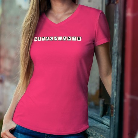T-shirt dame illustré du mot "Attachiante " en forme de lettres de Scrabble, un trait de caractère qui plait, même si les hommes ne le disent pas