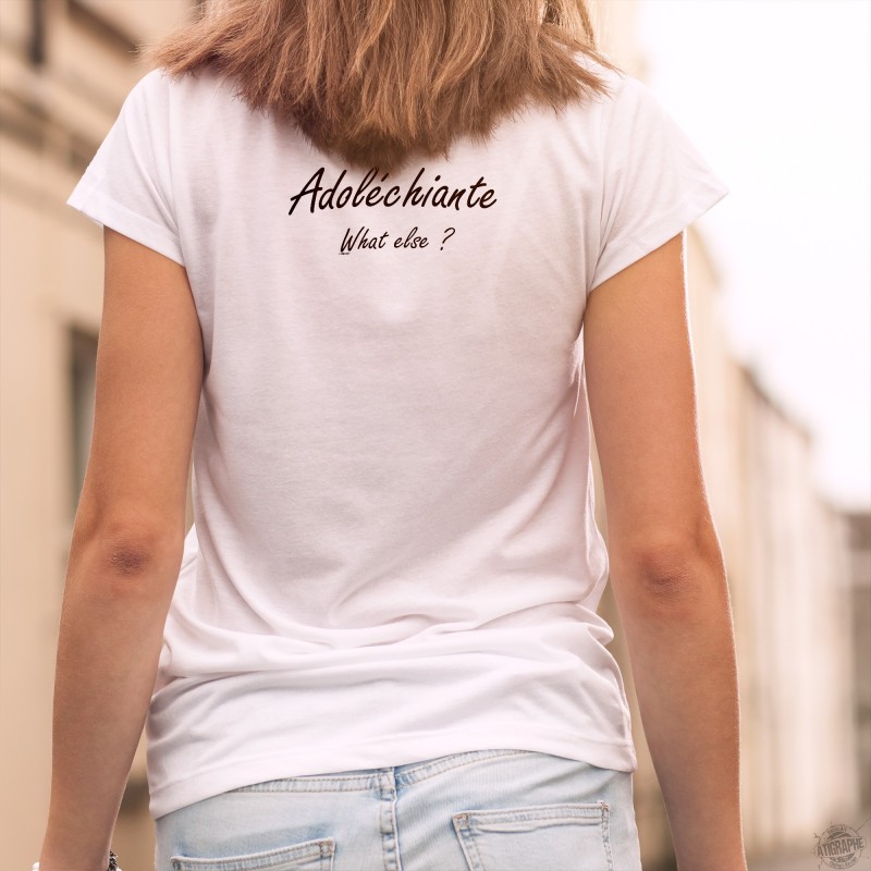 T-shirt humoristique mode femme illustré de la citation humoristique ★ Adoléchiante, what else ? ★ inspiré d'une célèbre publicité pour une marque de café, pour adolescente chiante