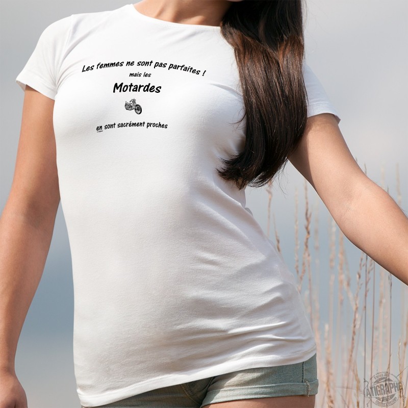 T-shirt mode dame illustré avec une magnifique moto Chopper et ❤ Les femmes ne sont pas parfaites ! mais les Motardes en sont sacrément proches ❤