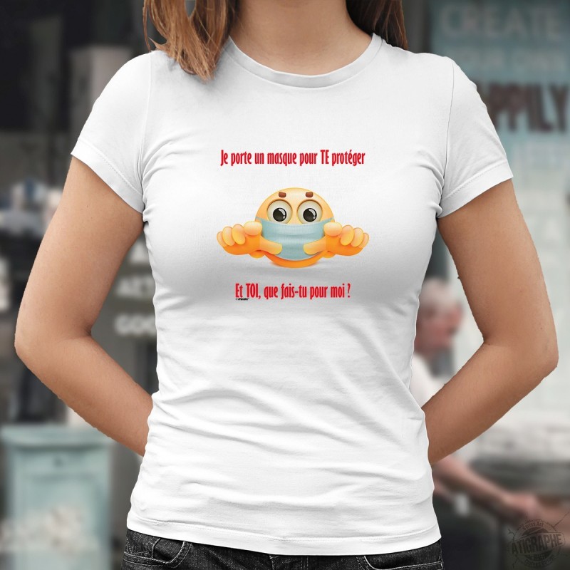 T-shirt mode dame avec la mention ✪ Je porte un masque pour TE protéger, et Toi que fais-tu pour moi ? ✪ et un émoticône portant un masque chirurgical pour le déconfinement
