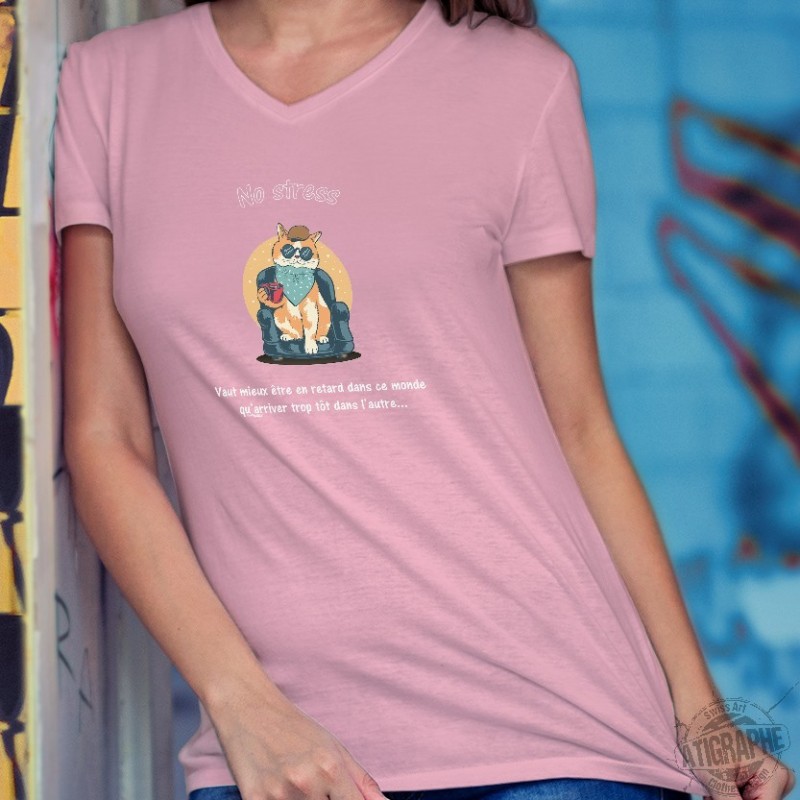 T-shirt coton dame, col en "V" avec un chat relax, portant béret et lunettes de soleil, assis sur un sofa, buvant un café et la citation humoristique ★ No stress, Vaut mieux être en retard dans ce monde qu’arriver trop tôt dans l’autre...★