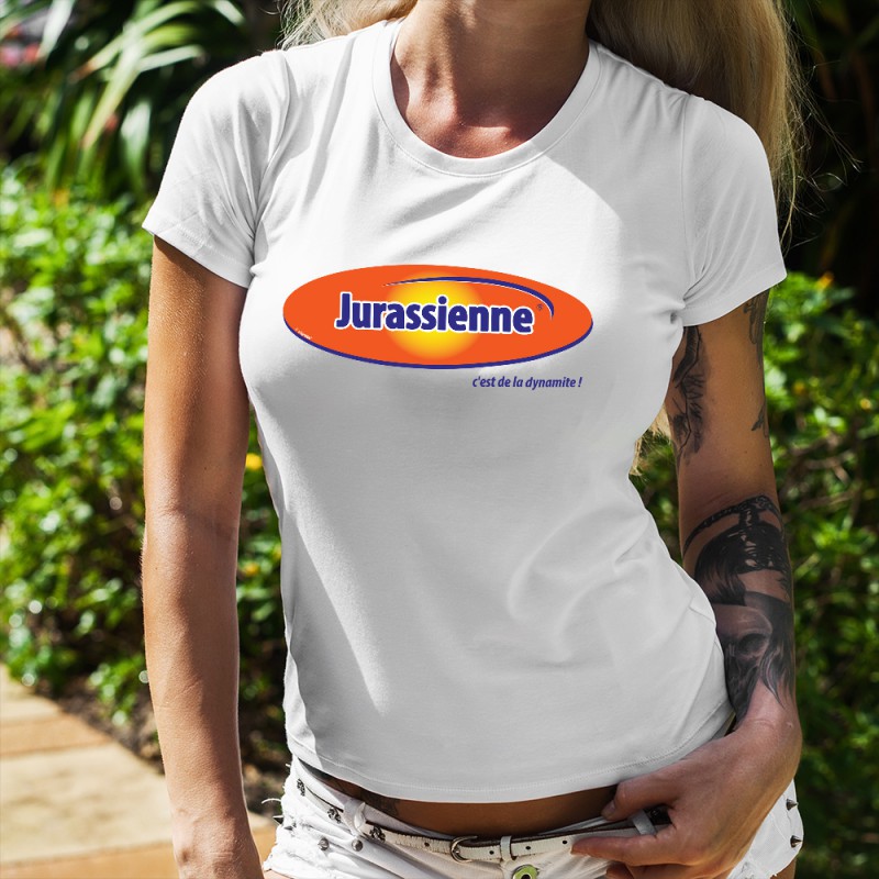 T-shirt à la coupe très féminine, illustré de la citation "Jurassienne, c'est de la dynamite !" et d'un pastiche du logo de la célèbre marque de pâtes à tartiner, de barres et de boissons à base d'oeuf, de malt et de chocolat