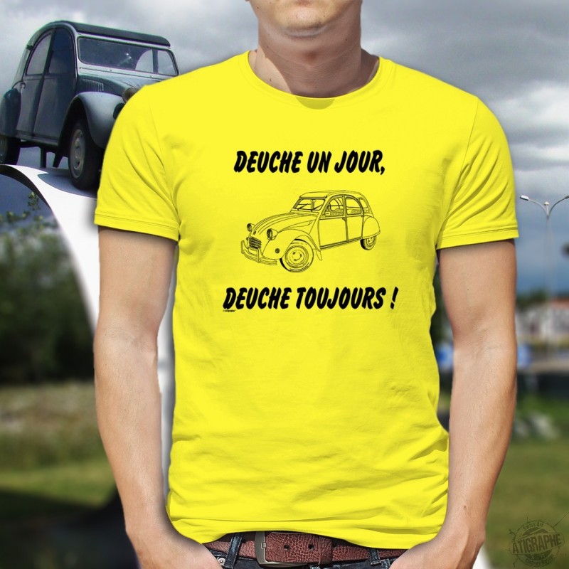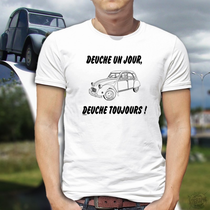 Découvrez notre T-shirt homme exclusif, illustré de la célèbre citation "Deuche un Jour, Deuche Toujours !" accompagné d’un dessin authentique de la légendaire Citroën 2CV.