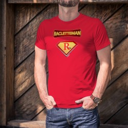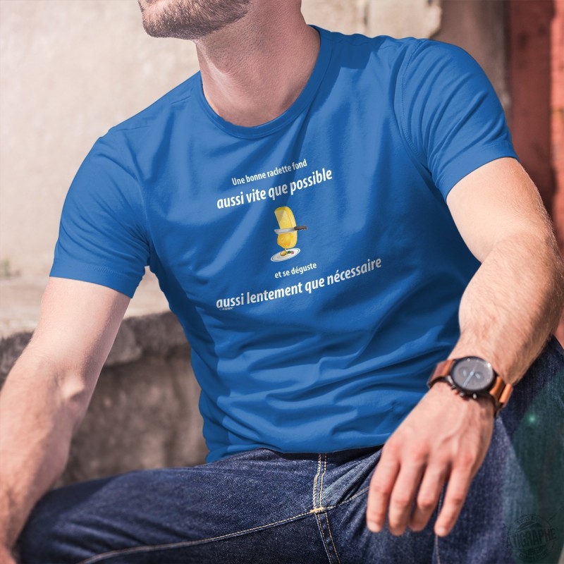 T-shirt homme en coton avec un fromage à raclette et une adaptation de la phrase culte d'Alain Berset ✚ Une bonne raclette fond aussi vite que possible et se déguste aussi lentement que nécessaire ✚