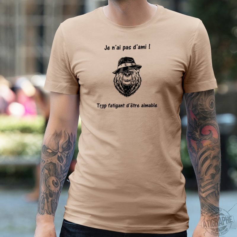 T-shirt homme avec ✪ J'ai pas d'ami ! ✪ trop fatigant d'être aimable ✪ (Jean Gabin) et un ours le regard sévère, portant un Borsalino et fumant un cigare