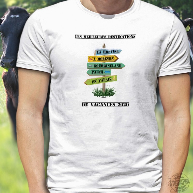 T-shirt homme avec ✚ Les meilleures destinations de vacances 2020 ✚ A Moléson pour une fondue, casser du gravier au Bourbineland, manger une raclette en Valais, au froid à la Brévine ou sous la pluie au Paléo, ah non ça ce n'est pas possible...