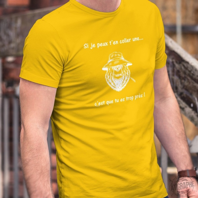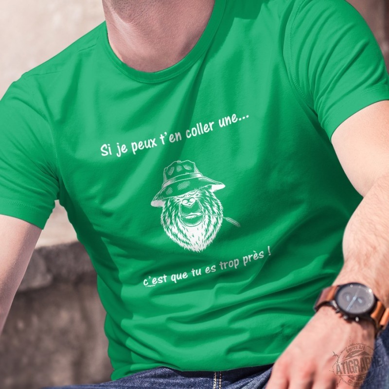 T-shirt 100% coton homme avec un ours mal léché et la phrase humoristique ✪ Si je peux t'en coller une... c'est que tu es trop près ✪ Utile pour garder la distance physique