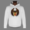 Donna Felpa bianca con cappuccio, illustrata con lo stemma svizzero, una croce bianca sotto uno sfondo rosso, tenuta da artigli che strappano il maglione