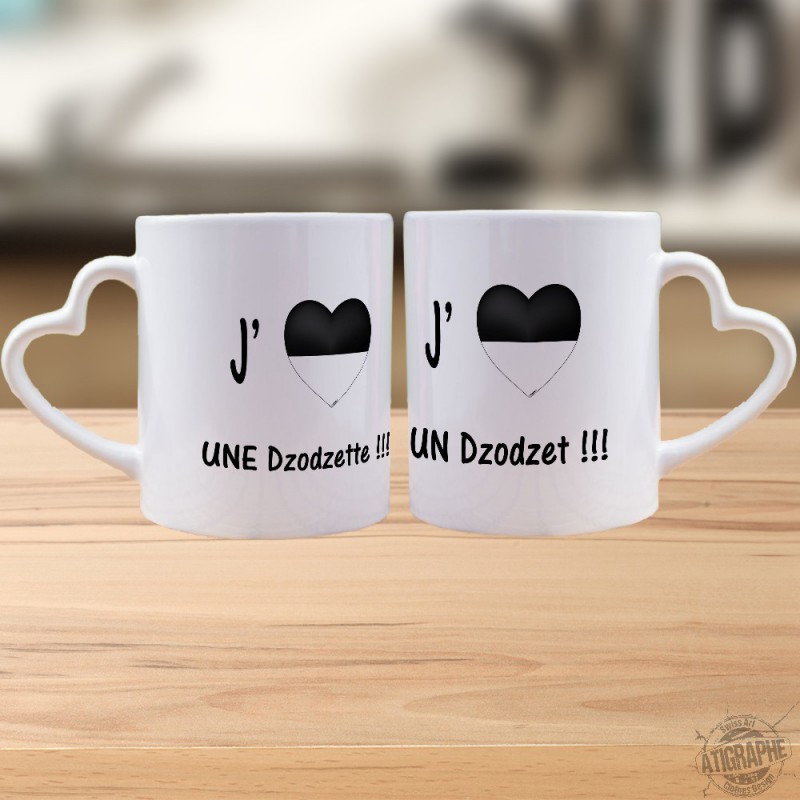 Set di due tazze con manico a forma di cuore, illustrato con J'aime une Dodzette, un Dzodzet