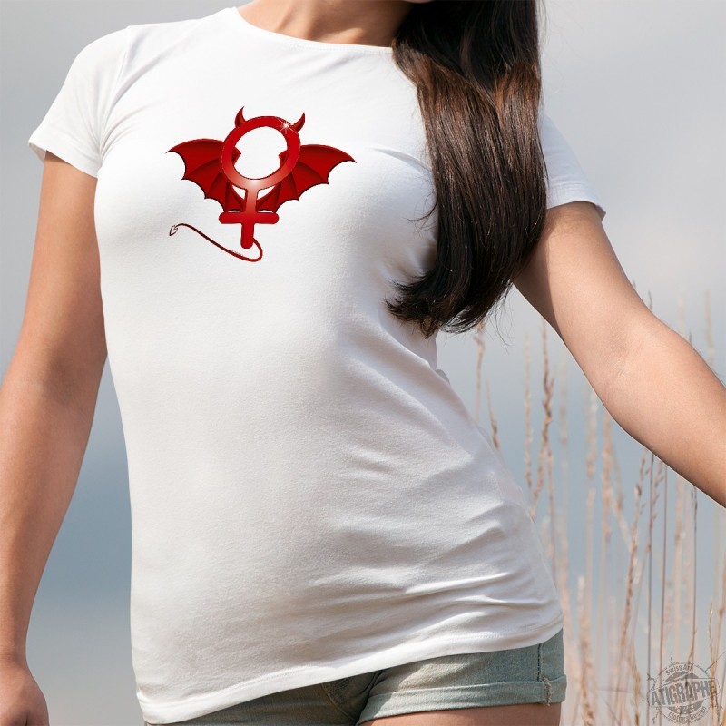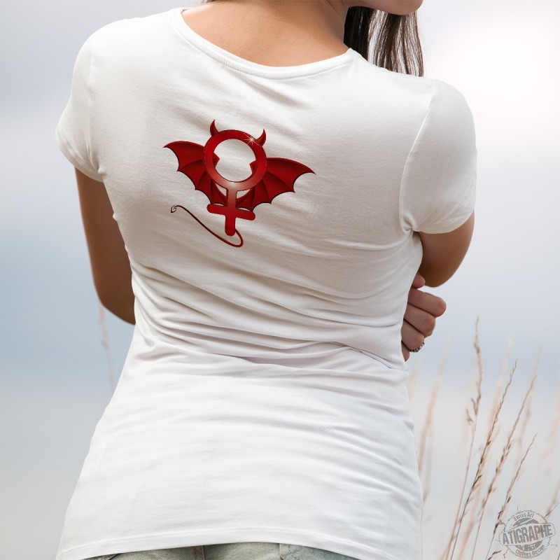 Sveglia il demone dentro di te ! T-shirt dal taglio molto femminile illustrata con il simbolo demonizzato della donna, femminilità demonizzata in 3D