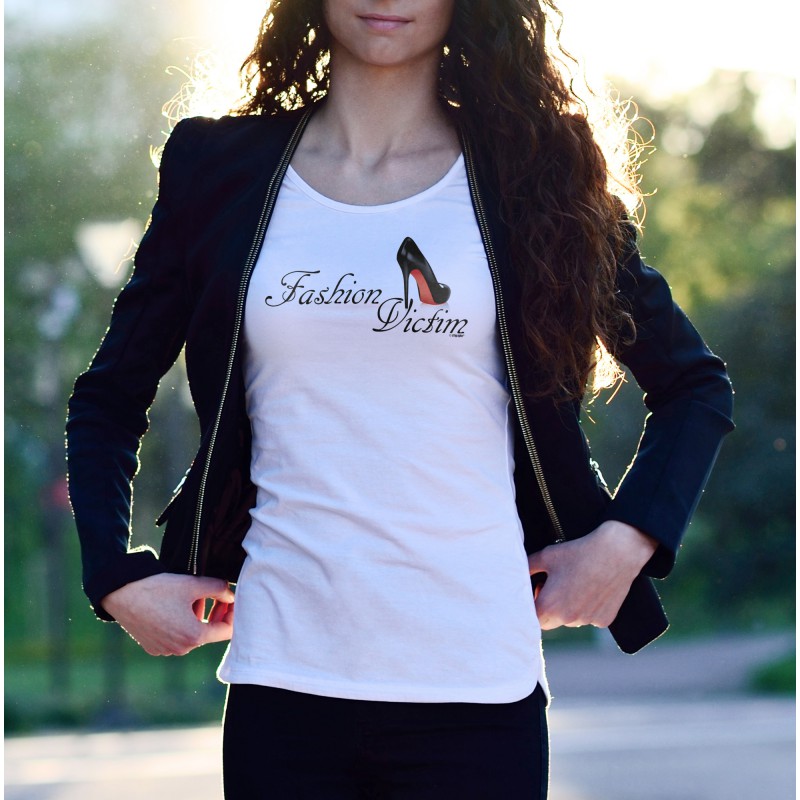 Donna T-shirt stretto illustrato con una scarpa nera tacco alto situato sul cuore e la citazione "Fashion Victim"