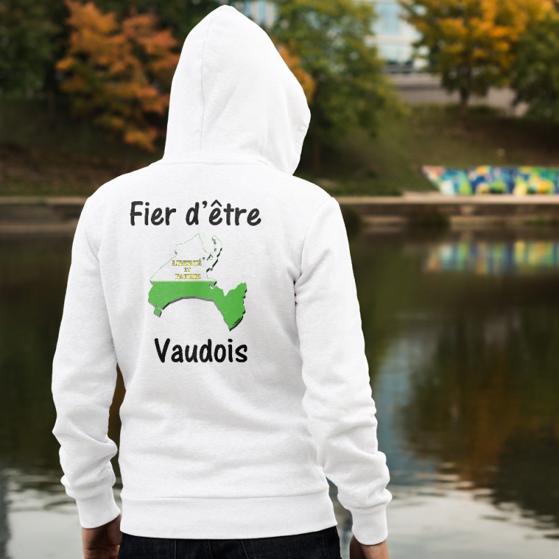 Felpa con cappuccio bianco, illustrata con i bordi di Vaudois intarsiata dalla bandiera Vaudois e lo slogan "Fier d'être Vaudois"