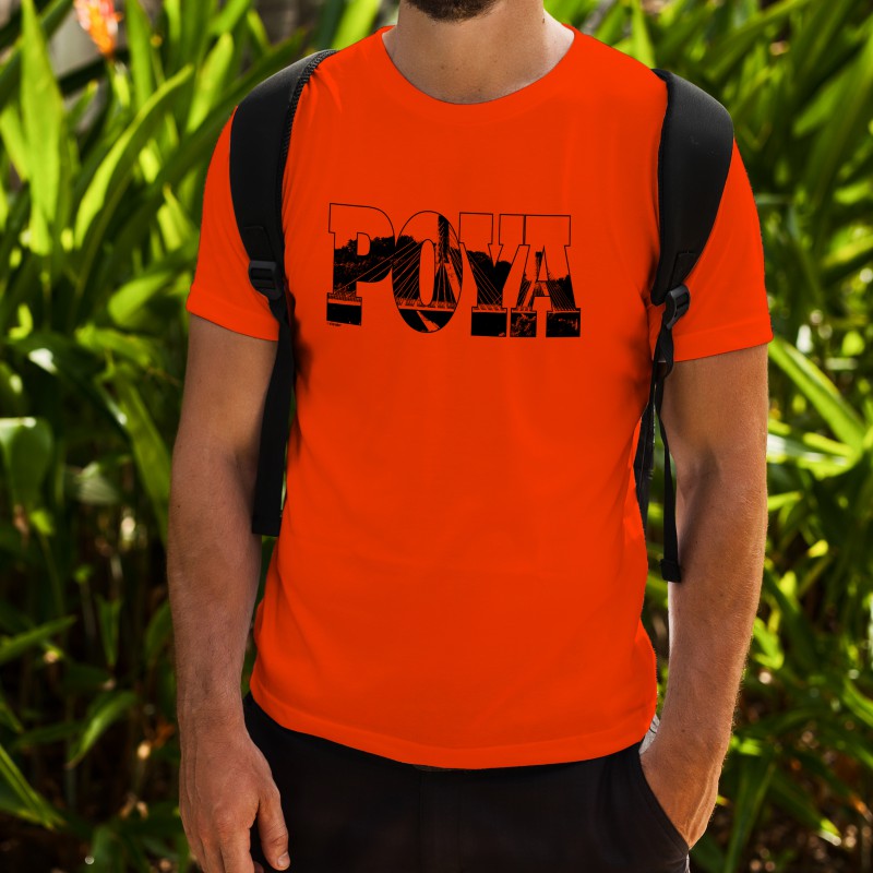 T-shirt illustrata con la parola "POYA" intarsiata con una foto del famoso ponte Poya in bianco e nero