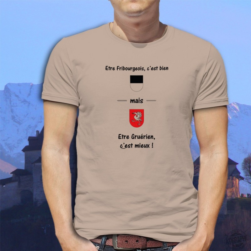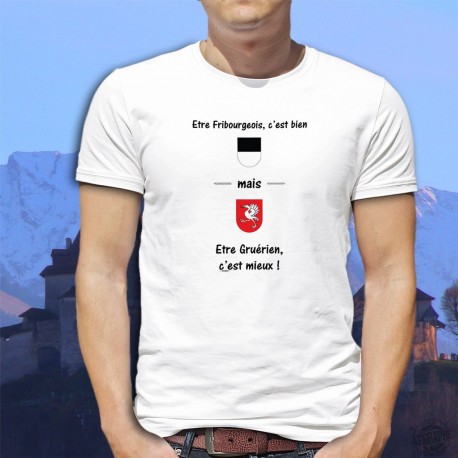 Funny T-Shirt umoristica illustrata con " Fribourgeois, bien mais être Gruérien, c'est mieux"