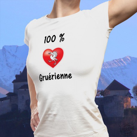 T-shirt di moda in un taglio molto femminile, illustrato con una gru in un cuore che rappresenta lo stemma di Gruyère e la citazione francese "100% Gruérienne"